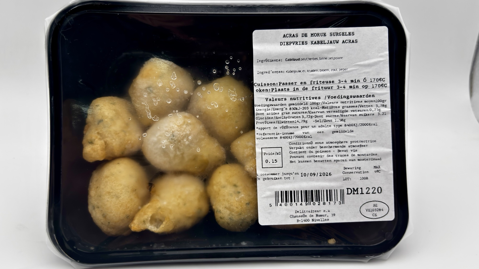 Accras de morue (+-150g)7,50€ quantité de Accras de morue (+-150g) Ajouter au panier Catégorie : Surgelés Description Les accras de morue (surgelés) sont une spécialité antillaise populaire, appréciée en apéritif. Produits apparentés Gambas surgelés 800g 21,50€ Ajouter au panier Scampis surgelés 800g 23,50€ Ajouter au panier Croquettes apéro (12pc) 14,00€ Ajouter au panier Croquettes de crevettes grises (6pc) 19,00€ Ajouter au panier