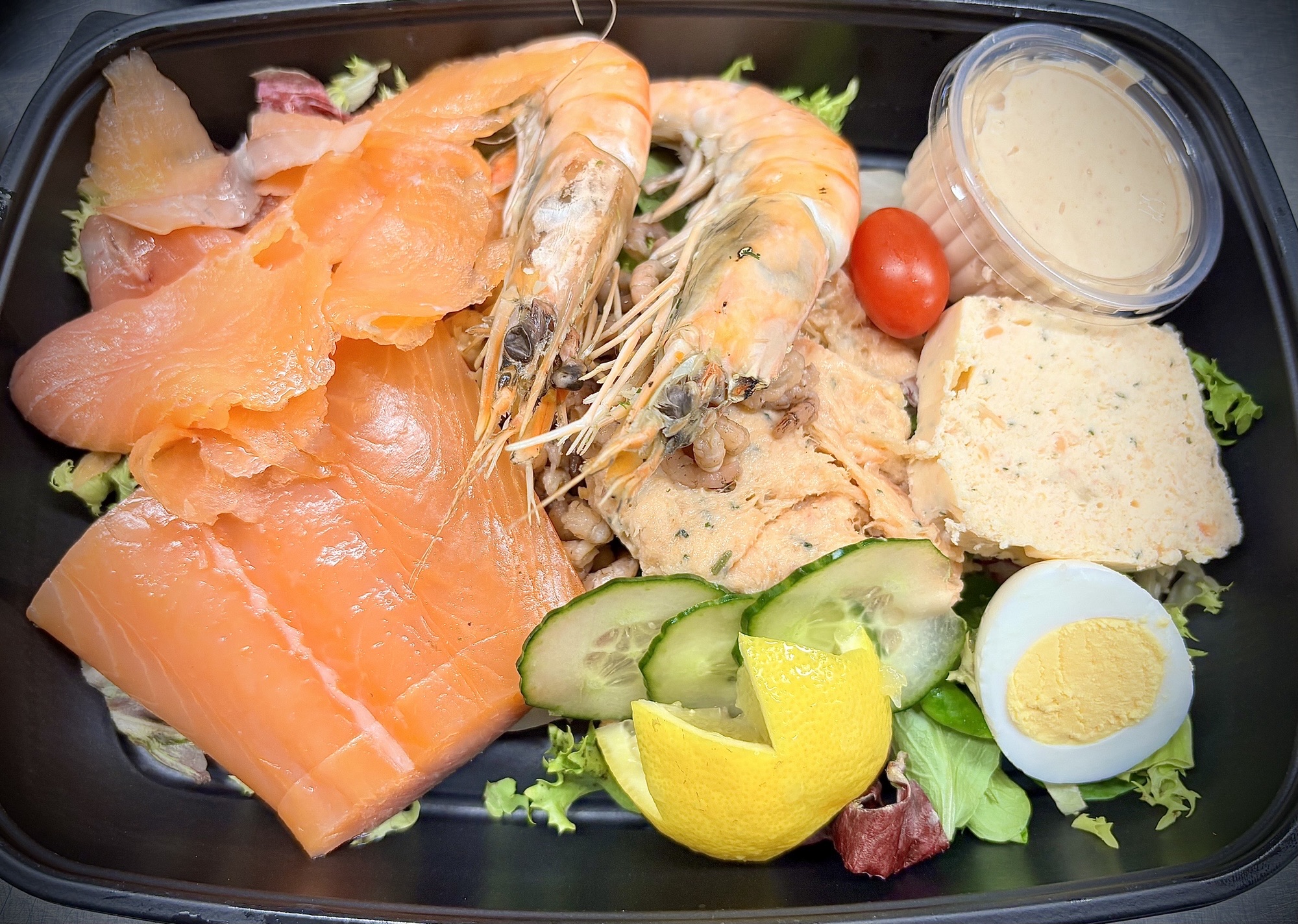 Saumon fumé, saumon mi-cuit, rillette de saumon, terrine de saumon, crevettes grises, gambas et ses garnitures.