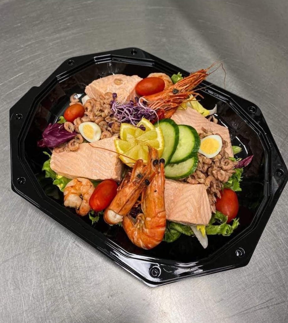 Saumon BELLEVUE, crevettes grises, gambas et ses garnitures – 23€/pp