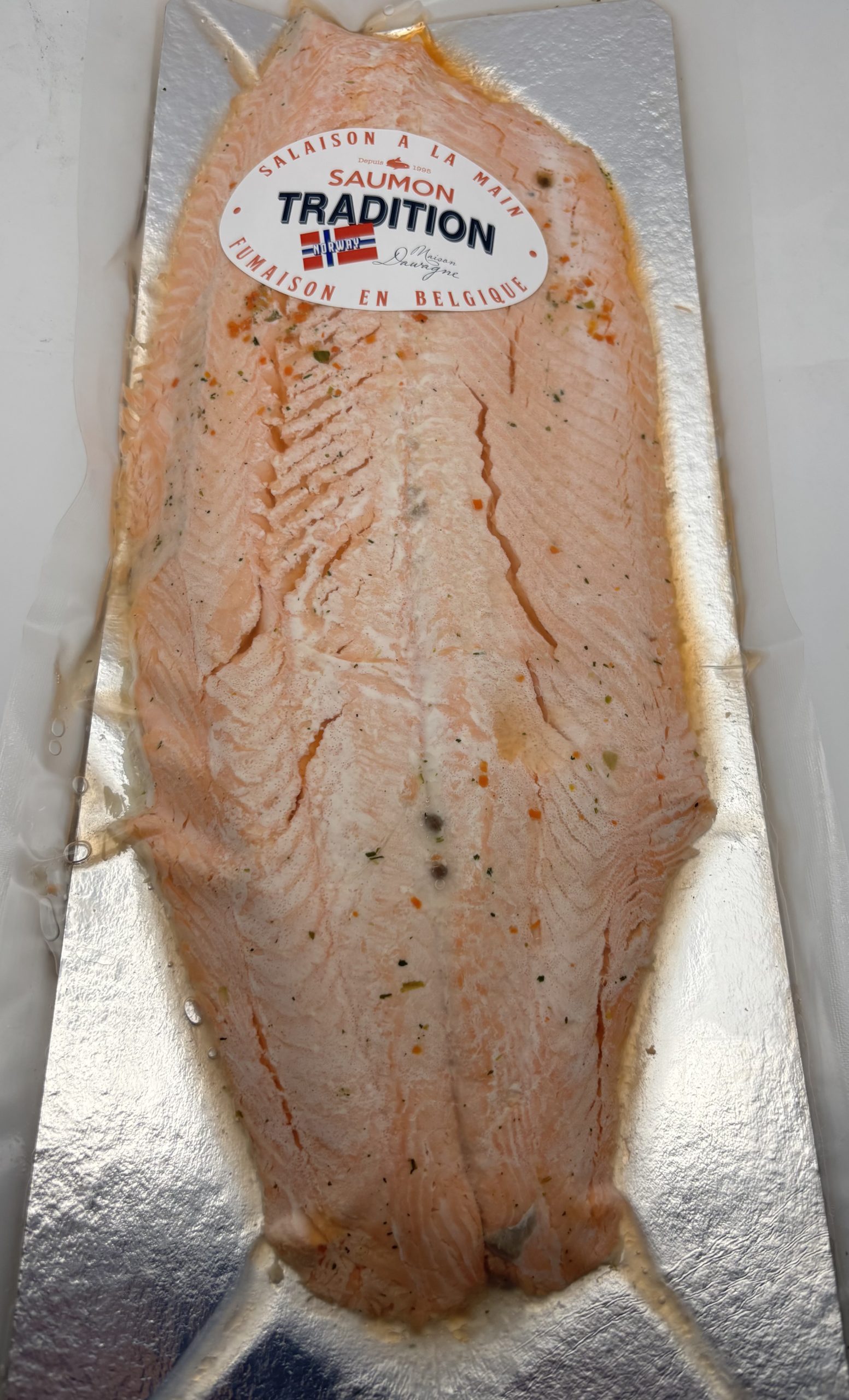Saumon Bellevue entier (+-59,50€/filet)59,50€ quantité de Saumon Bellevue entier (+-59,50€/filet) Ajouter au panier Catégorie : Saumon Description Filet BV sur plaquette – poids moyen : 1,4kg Prix : 42,50€/kg Produits apparentés Saumon fumé Norvégien filet entier tranché machine (+-59,50€/filet) 59,50€ Ajouter au panier Filet frais de saumon écossais (+-44,10€/filet) 44,10€ Ajouter au panier Filet frais de saumon norvégien (+-41,90€/filet) 41,90€ Ajouter au panier Pavé de Saumon Bellevue (+/- 200gr) 8,50€ Ajouter au panier