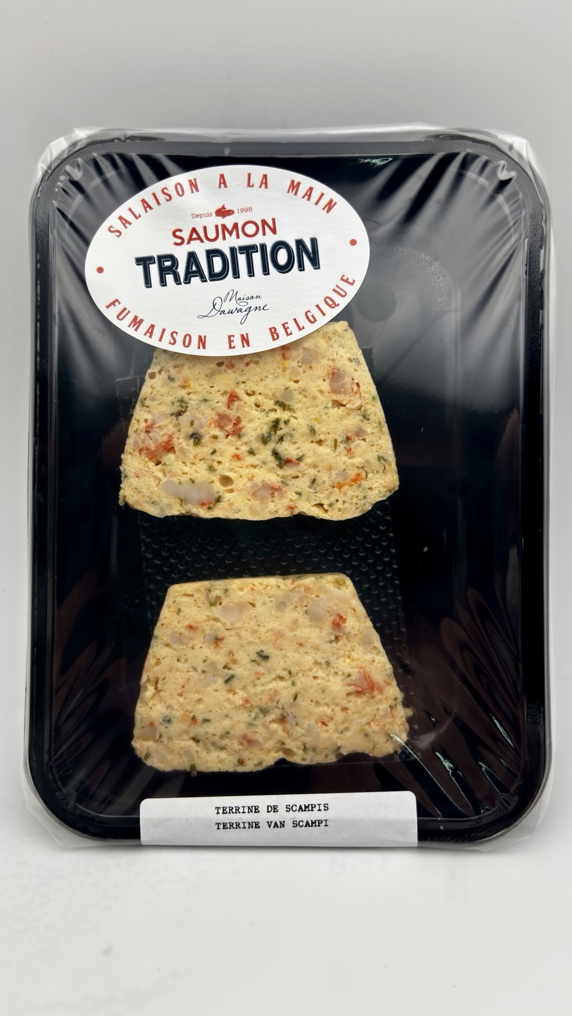 Terrine de scampis7,50€ quantité de Terrine de scampis Ajouter au panier Catégorie : LES PLATS PREPARES MAISON Description Terrine de scampis onctueuse, délicatement parfumée aux herbes, à savourer froide en entrée. Prix : 7,50€ Produits apparentés Gambas cuites 6pc 9,90€ Ajouter au panier Ravioles de noix de Saint-Jacques aux petits légumes 17,50€ Ajouter au panier Terrine de Saumon 7,50€ Ajouter au panier Quiche Lorraine 7,50€ Ajouter au panier